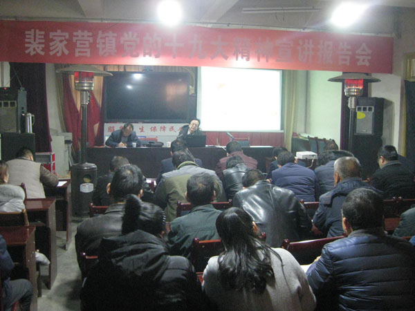 根据县委安排,裴家营镇于12月8日组织召开了“裴家营党的十九大精神宣讲报告会议”,会议邀请到县委党校副校长杜生坚同志为镇领导干部、村党支部书记及农村党员代表做了十九大精神的专题宣讲,参会人员共80余人。
