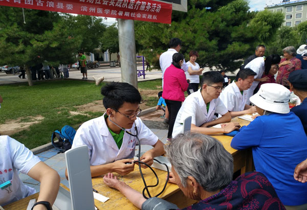 来自滨州医学院的青年医生们组成志愿者义诊服务队,为居民提供量血压、艾灸、开处方等免费健康检查,并发放健康知识宣传材料以及提供健康咨询。
