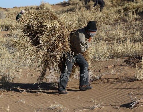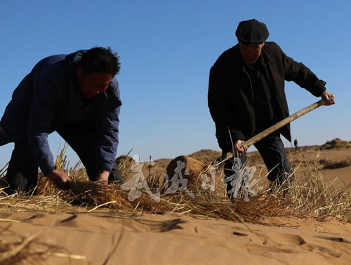 11月26日,古浪县麻黄塘治沙点上,一望无际的草方格向沙漠深处延伸,治沙工人一步一个脚印,开沟、背草、压沙……